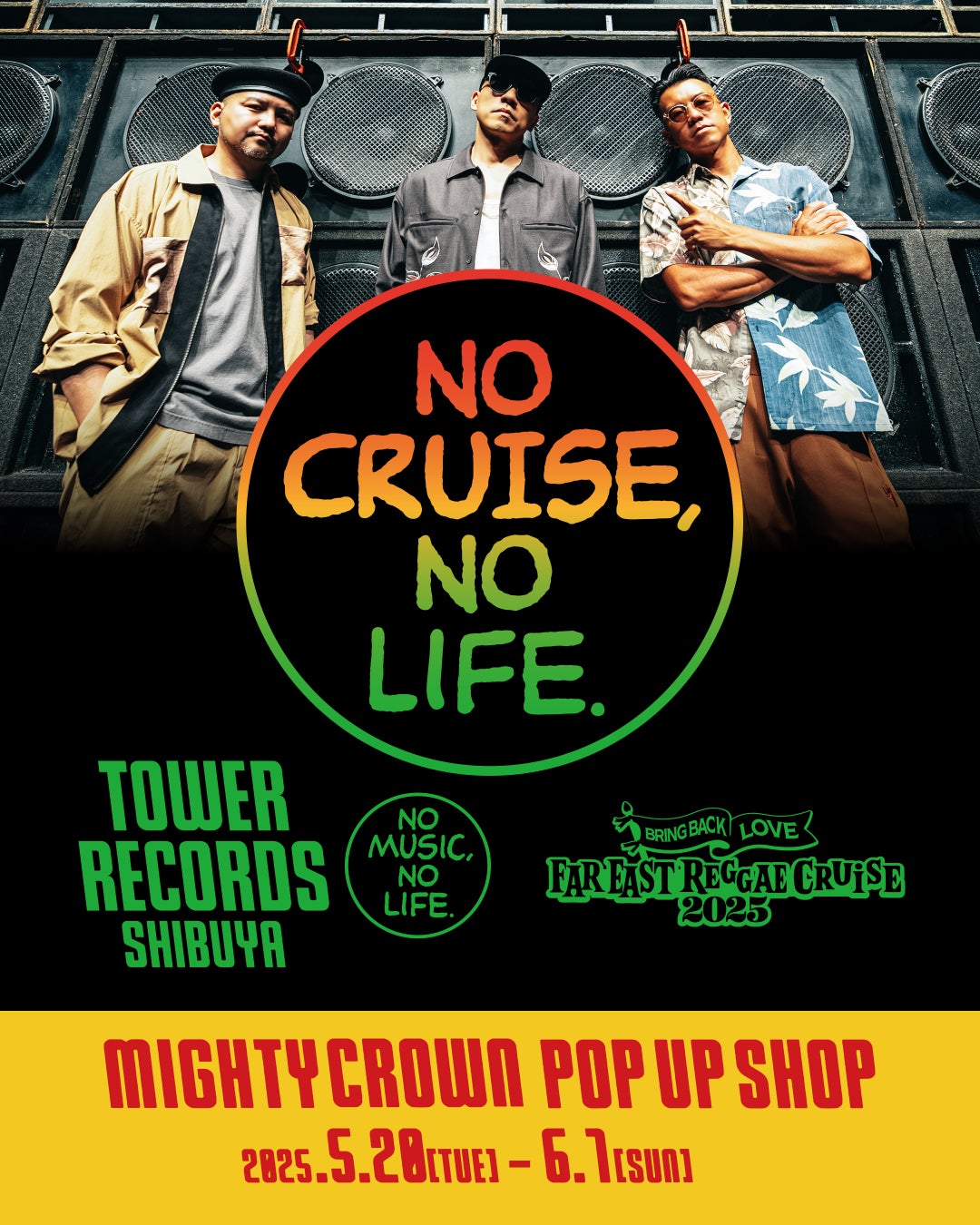タワーレコードでは、今年9月に開催される移動式ミュージックフェス「FAR EAST REGGAE CRUISE 2025」を記念して、5月20日(火)~6月1日(日)の期間、タワーレコード渋谷店にて“NO CRUISE, NO LIFE.”をテーマとしたポップアップ・ショップ「MIGHTY CROWN POP UP in タワーレコード渋谷店」を開催することが決定しました。