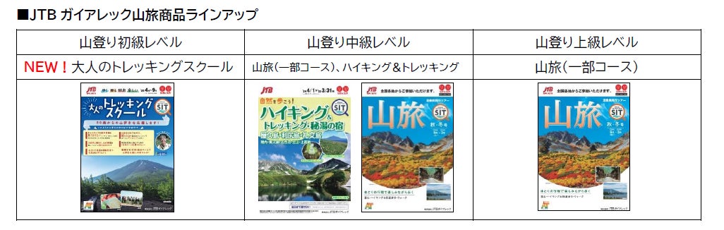 株式会社JTBガイアレック (代表取締役:横山 征夫、以下「JTBガイアレック」) は、「歩く・登る・健康・楽しい」をテーマに、ゆっくり歩いて山歩きを楽しむ、初心者向けの 『大人のトレッキングスクール』 を新たに発売しました。