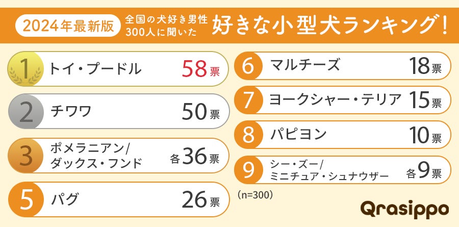 今回は事前調査で「犬が好き」と回答した全国の犬が好きな男性300人を対象に『好きな小型犬』についてアンケートを実施。