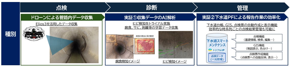 ドローンによる点検データのAI解析や、GIS連携管理台帳※3でのデータ一元管理と点検票の自動作成などの技術を組み合わせた、一気通貫の点検・診断・管理に関する実証を行います。