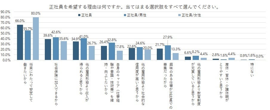 「将来にわたって安定して働きたいから」66.0%、「社会保険に加入できるから」39.6%、「他の雇用形態より収入が得られると思うから」34.9% 男性のほうがキャリアアップや収入額を重視している傾向