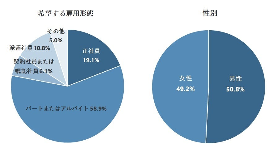 性別との関係をみると、「男性」のほうが「女性」よりも「気楽に働きたいから」が11.7pt、「一定期間で計画的に働けるから」が8.3pt、「正社員としての職が得られないから」が8.0pt高くなった。心身に負担をあまりかけない範囲で仕事を探している人と、取り急ぎ仕事につきたいという人が多いようだ。