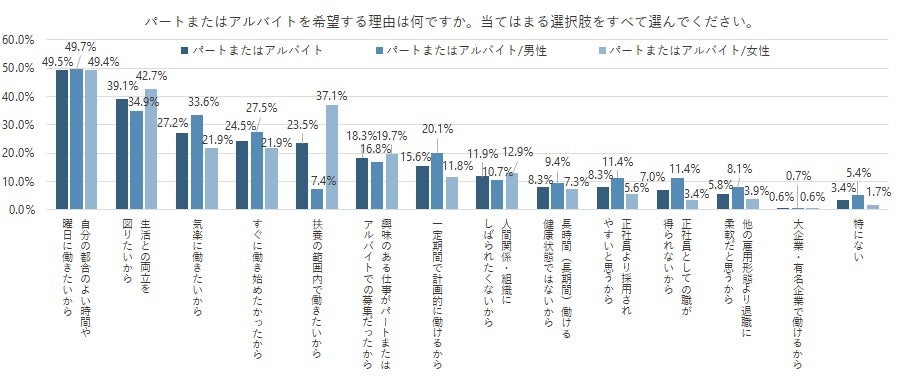 求人に応募した、パートまたはアルバイトを希望する人に、なぜその雇用形態を希望するのかを聞いた(複数回答)。最も多かったのは「自分の都合の良い時間や曜日に働きたいから」で49.5%、次いで「生活との両立を図りたいから」が39.1%、「気楽に働きたいから」が27.2%となった。