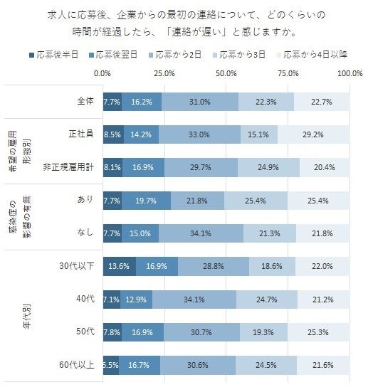 応募した企業からの最初の連絡 半数以上が2日たった段階で遅いと感じる「応募から2日」31.0%、「応募から4日以降」22.7%、「応募から3日」22.3%