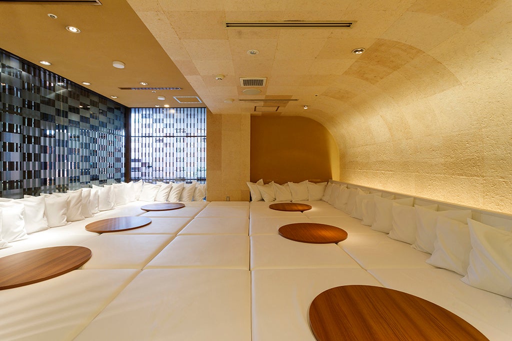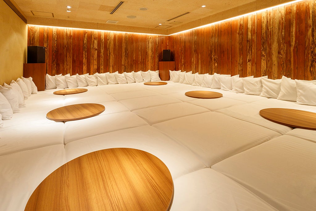 日本の伝統家屋を思わせる引き戸を開けると、その先に広がるのは、真っ白のマットレスとクッションが木目の壁と調和を成す小上がり席と、伝統的でありながらモダンな雰囲気をも醸し出すテーブル席。