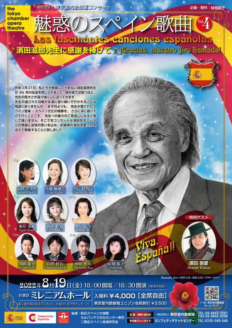 ⼀般社団法⼈東京室内歌劇場(東京都中央区、代表:杉野正隆)主催、『魅惑のスペイン歌曲Vol.4 ♪濱田滋郎先生に感謝を捧げて♪』が2022年8月19日 (金)に台東区ミレニアムホール(東京都台東区西浅草3-25-16 2階)にて上演されます。