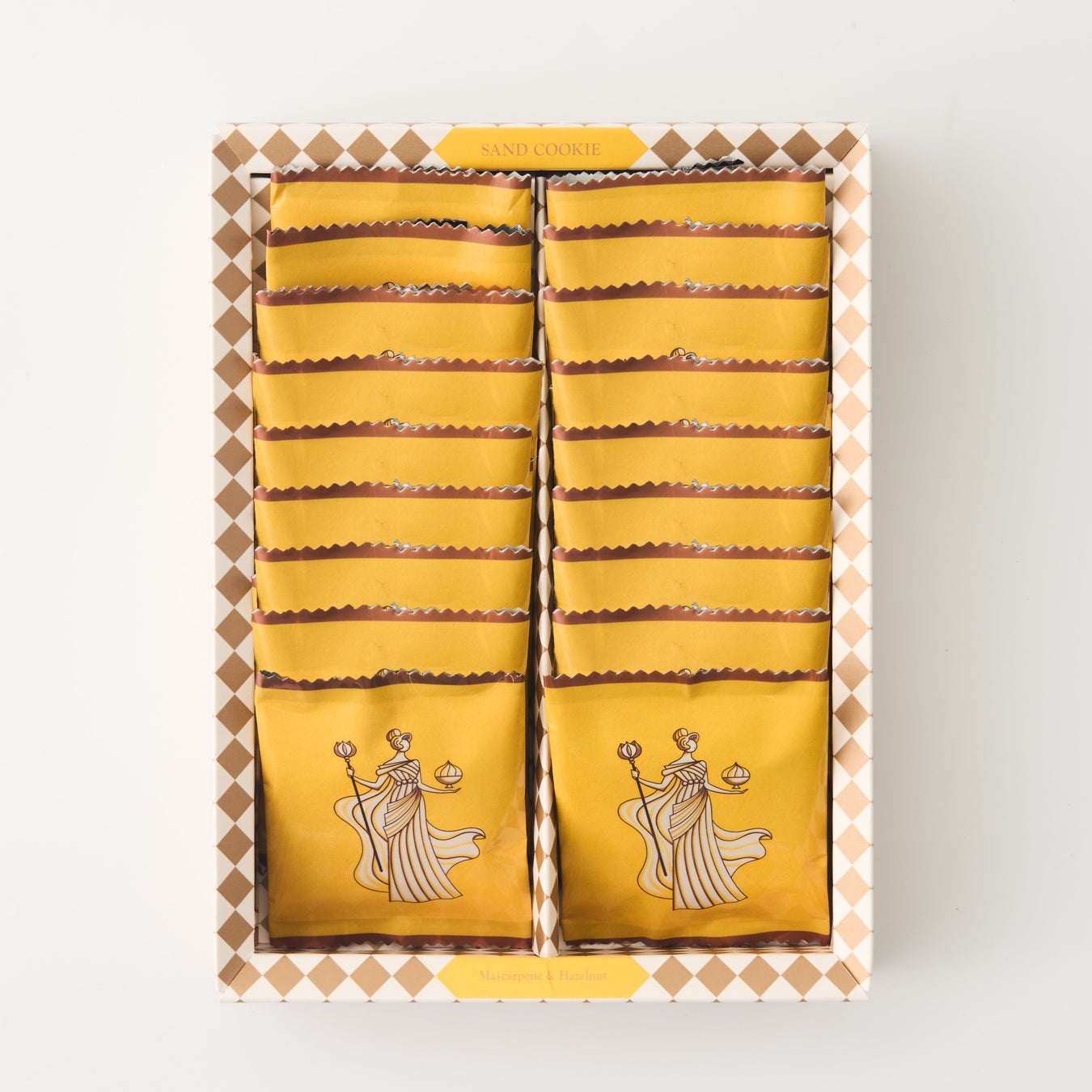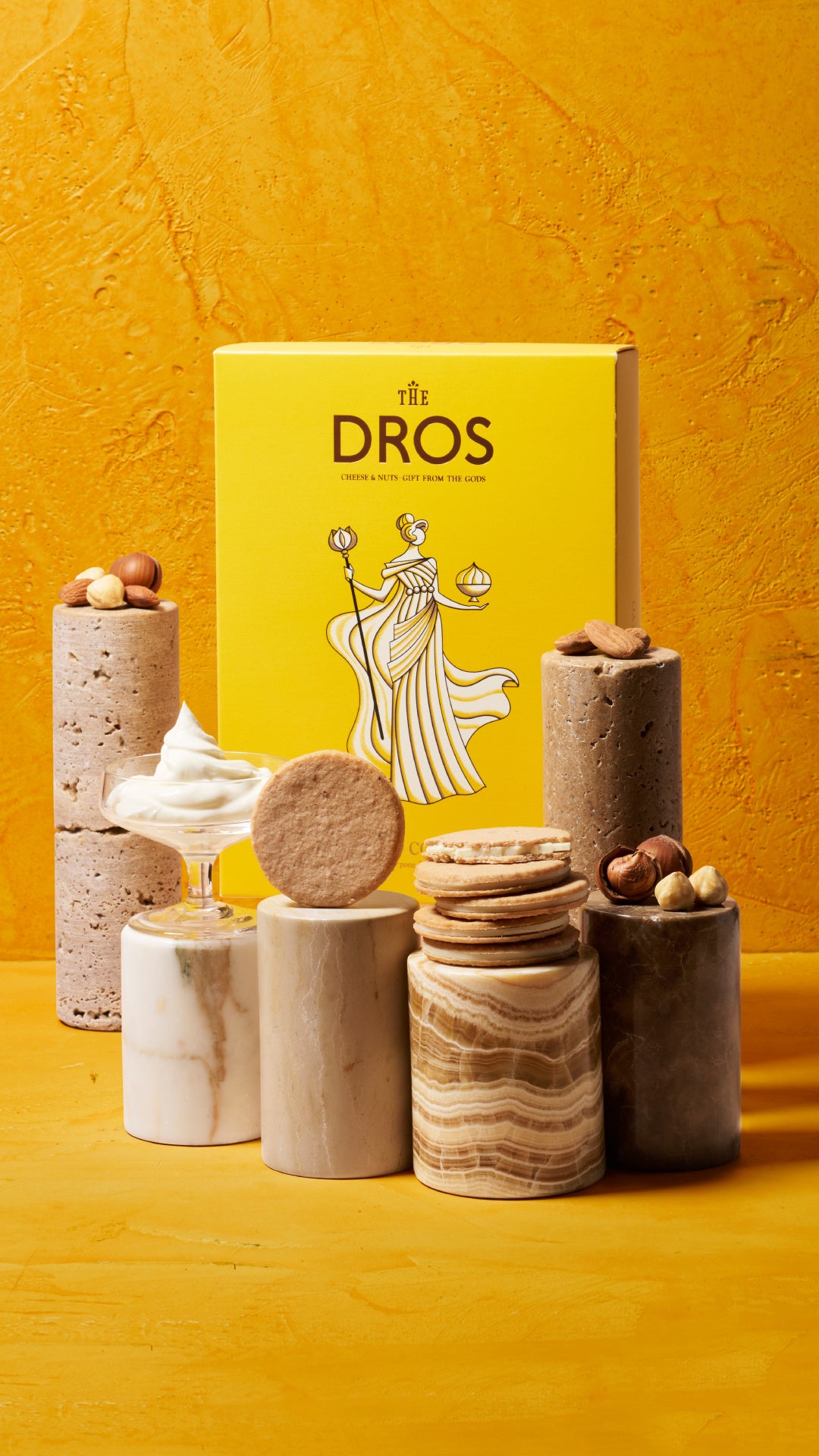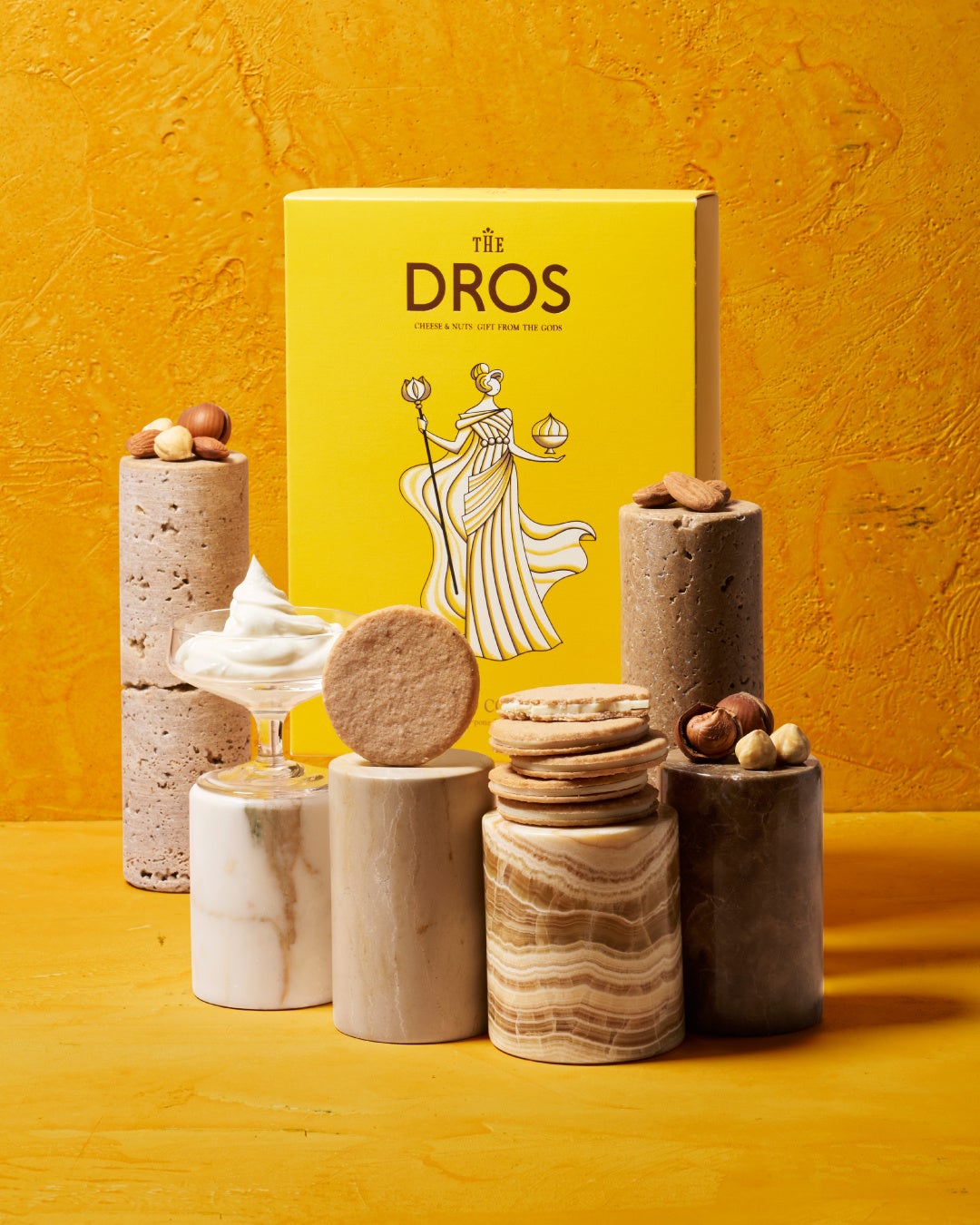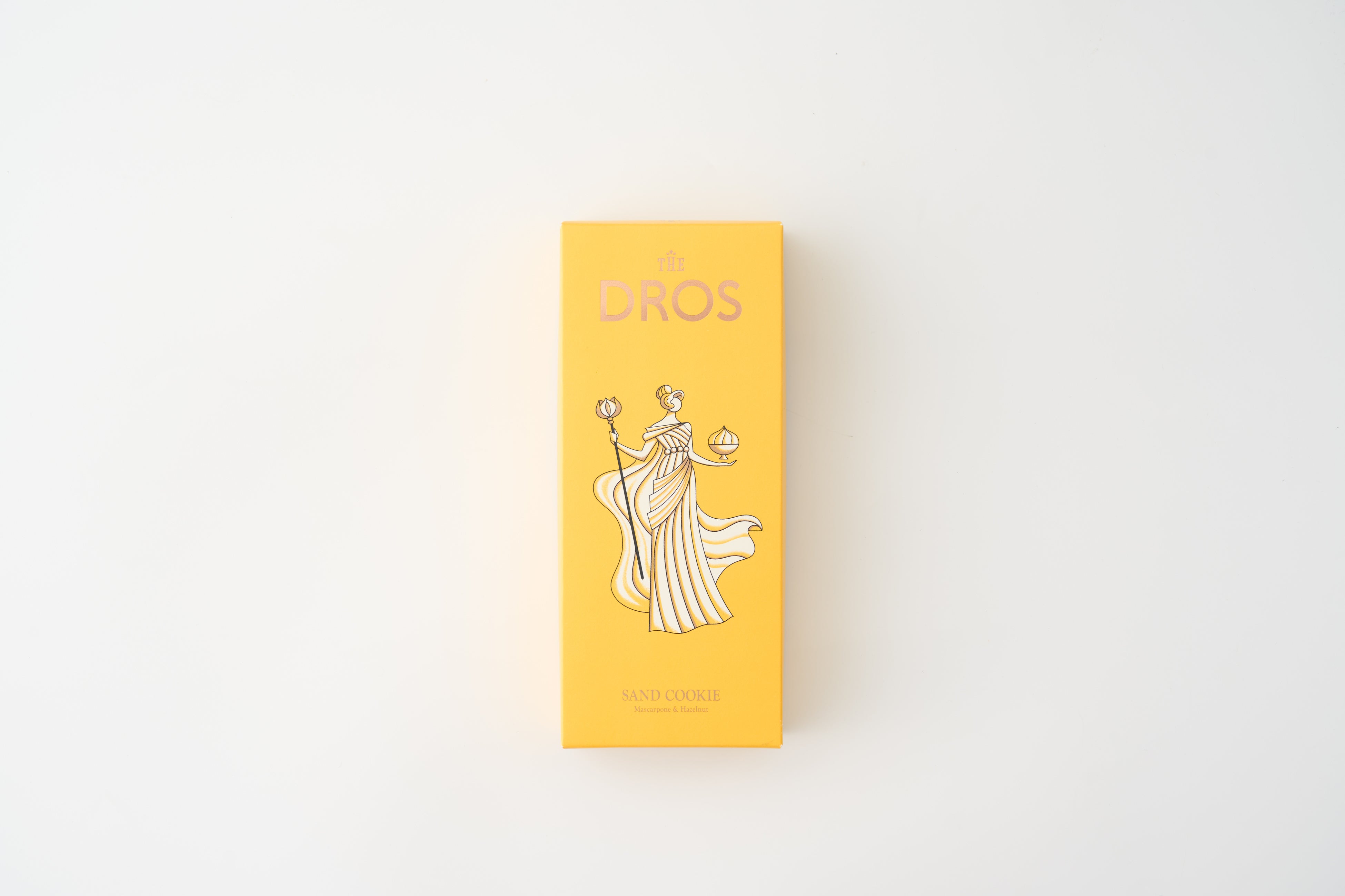 【DROS】らしいカラーを基調としたデザインは、ブランドを象徴するかのような一品。マスカルポーネチーズとヘーゼルナッツを携える神々しい女神の姿が印象的なパッケージに仕上げました。