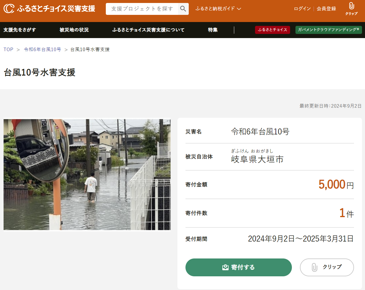 国内最大級のふるさと納税総合サイト「ふるさとチョイス」を企画・運営する株式会社トラストバンク(本社:東京都品川区、代表取締役:川村憲一、以下「トラストバンク」)は9月2日、ふるさと納税で被災自治体の災害支援に寄付できる仕組み「ふるさとチョイス災害支援」( https://www.furusato-tax.jp/saigai/ )で、令和6年台風10号により被災した岐阜県大垣市の「災害時緊急寄付申込みフォーム」を開設しました。ふるさとチョイス災害支援は、自治体からのお礼の品がなく、寄付金は被災地の復旧・復興に使われます。