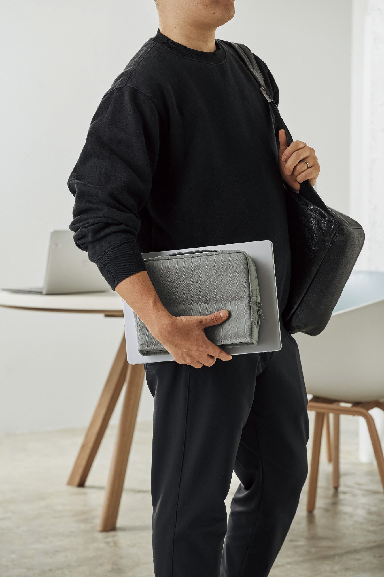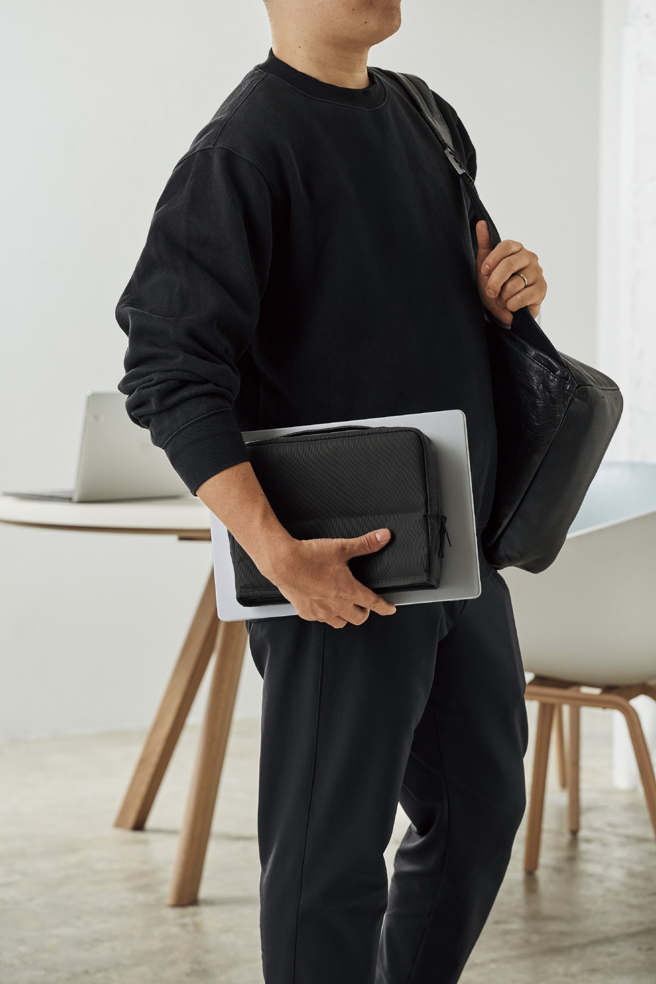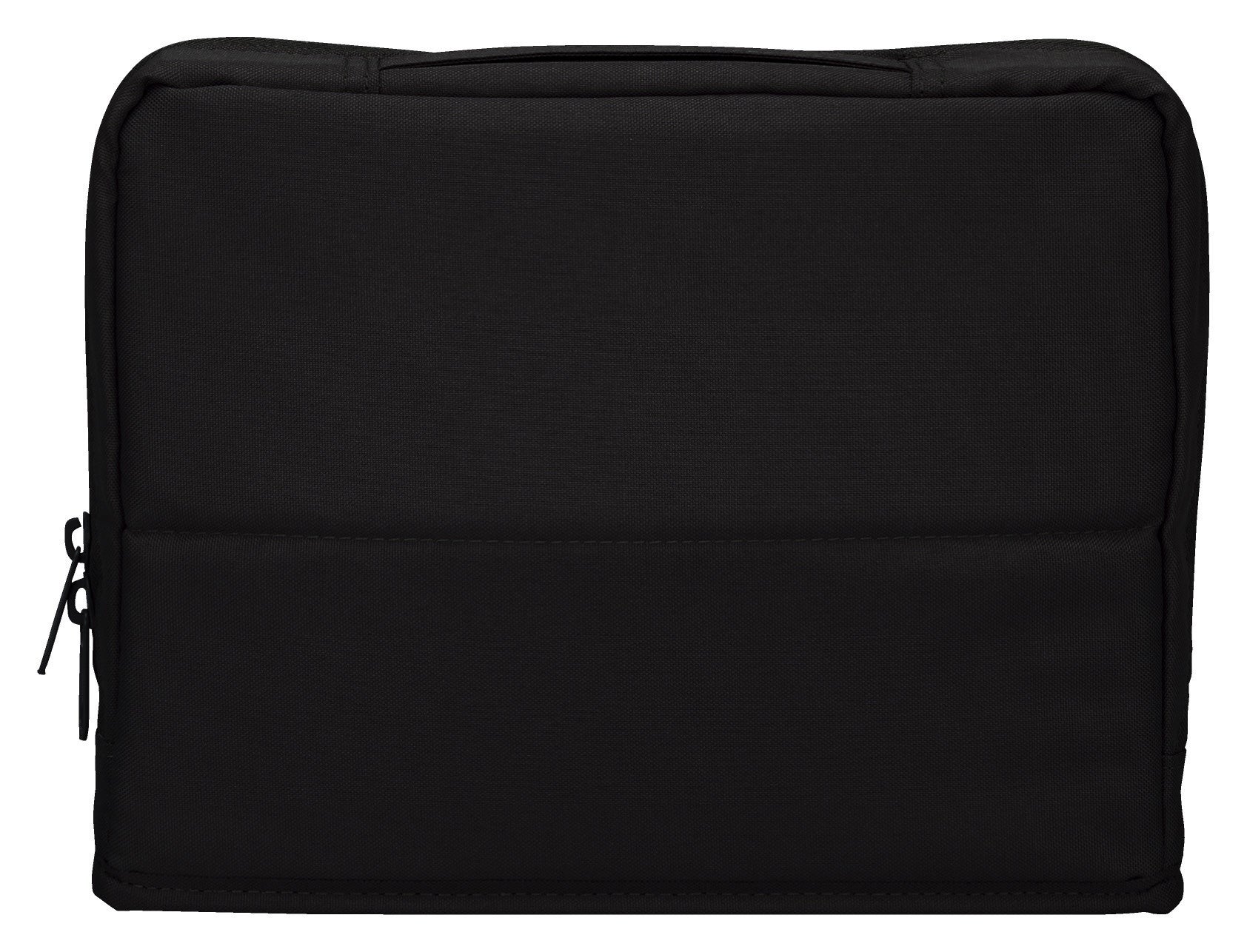 外側には落ち着いた風合いのポリエステル生地を採用しており、ビジネスシーンからカジュアルなシーンまで幅広く使いやすいデザインです。四角い薄型形状でバッグやロッカーへの収まりも良く、社内移動はもちろん、外出先へもスマートに持ち運ぶことができます。