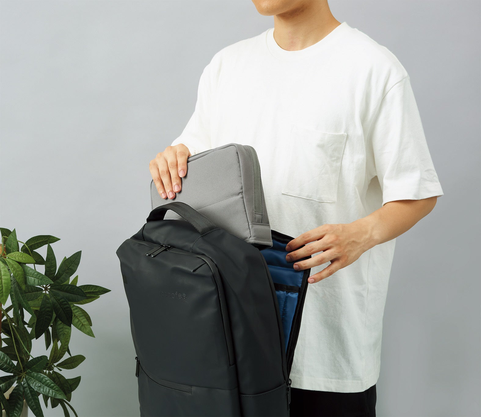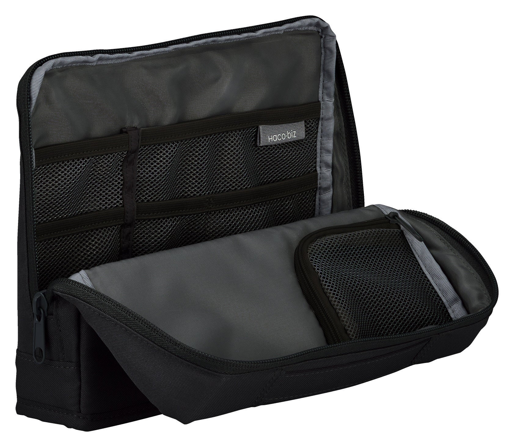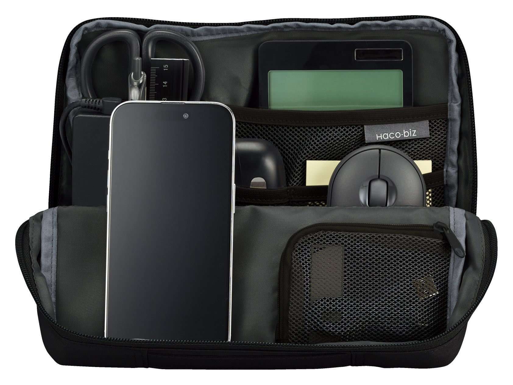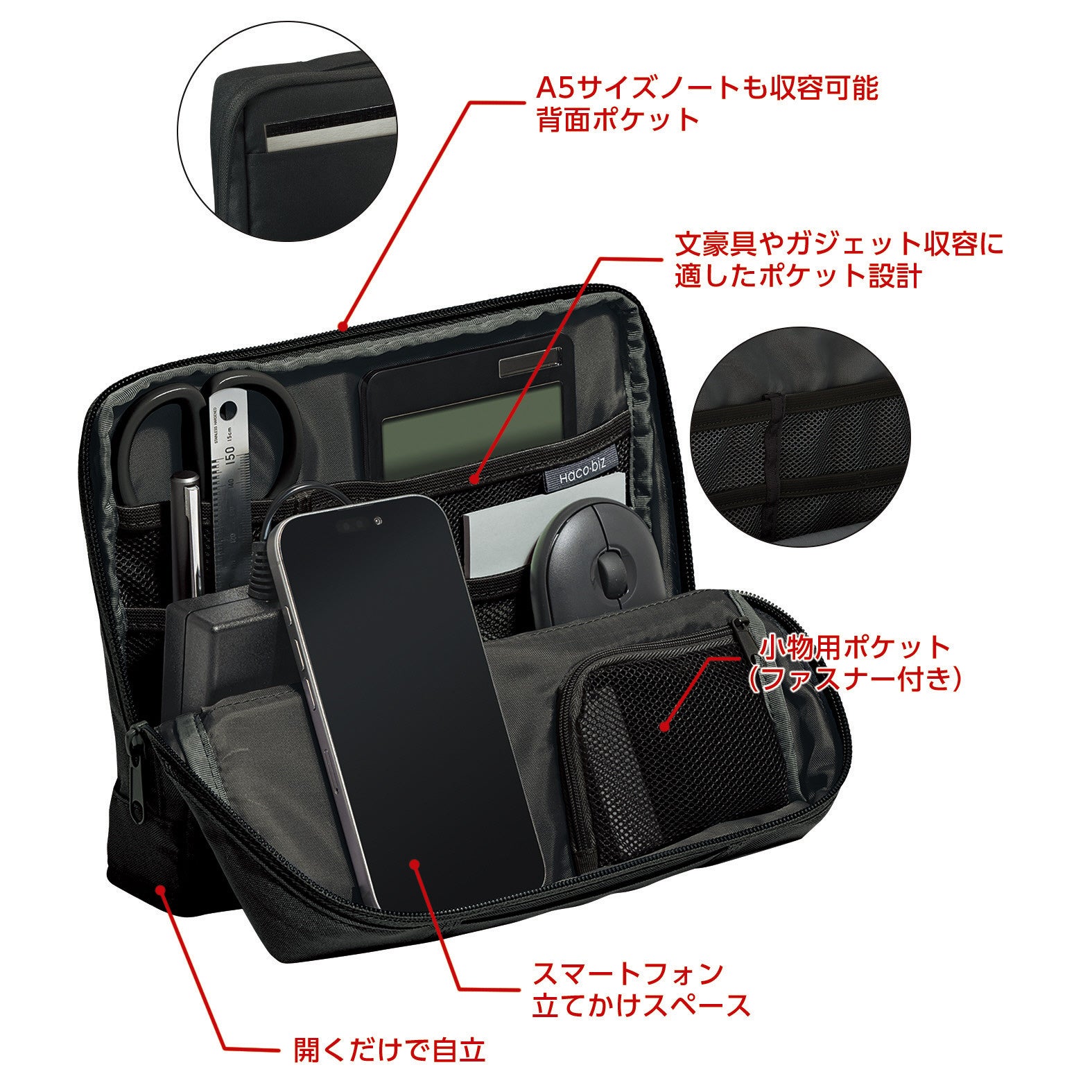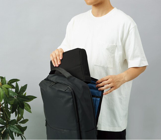 マウスやACアダプターなどの大きめのガジェット類を収容できるスペースと、ペンやイヤホンなどの文具や小物類を整理しやすい6つのポケットや仕切りを備えているため、より収容力がアップしました、また、ファスナーを開けるだけで開口部が前方に広がって自立する構造のため、必要なものをスピーディーに取り出すことができます。フリーアドレス環境で働くオフィスワーカーの仕事効率の向上をサポートします。