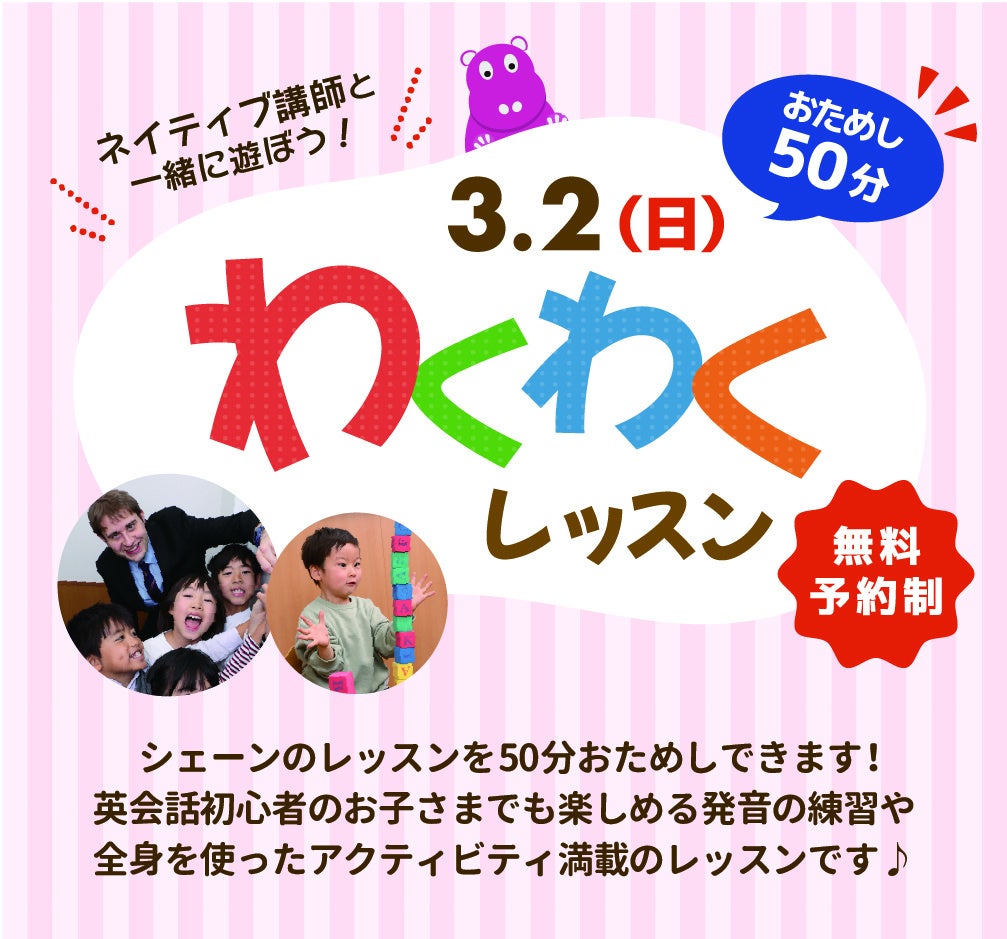 【シェーン英会話】3月2日開催!新年少~新中学2年生対象「無料おためしレッスン」