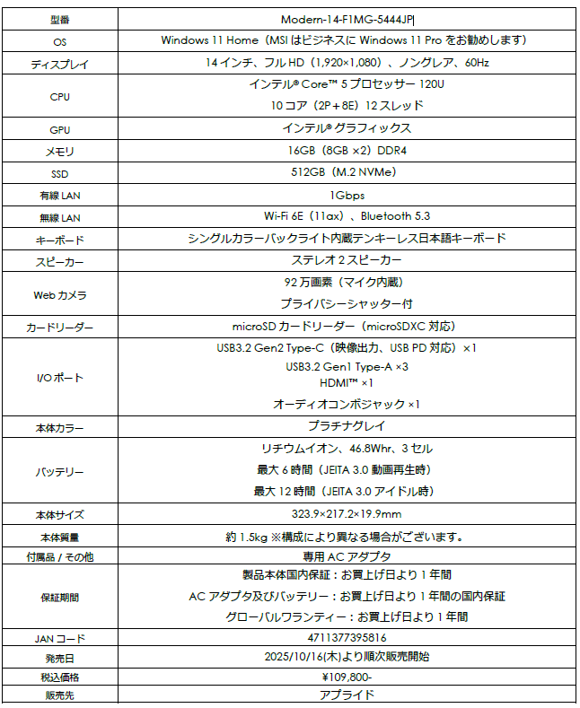 この度、エムエスアイコンピュータージャパン株式会社は、日常使いからビジネス用途まで幅広く活躍するスタンダードノートPC「Modern」シリーズの中でも、軽量・コンパクト・スタイリッシュなデザインで気軽に持ち運べるだけでなく、高いパフォーマンスも備えた「Modern 14 F1M」より、アプライド限定モデルとして「Modern-14-F1MG-5444JP」を本日2025年10月16日(木)より順次販売いたします。