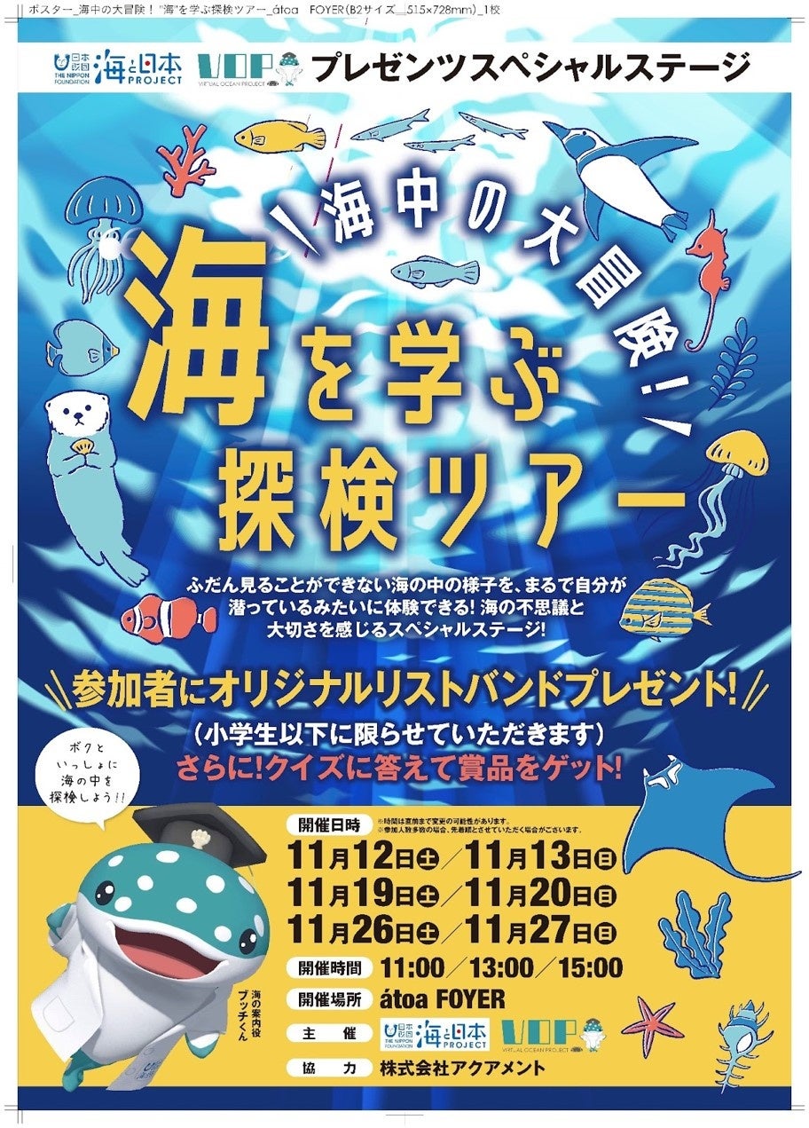 一般社団法人 子ども冒険体験創造ラボは、2022年11月12日(土)〜11月27日(日)までの毎週土日に、神戸の都市型水族館 AQUARIUM ✕ ART átoa(アトア)でVirtual Ocean Project 企画イベント「海中の大冒険! "海"を学ぶ探検ツアー」を開催いたします。