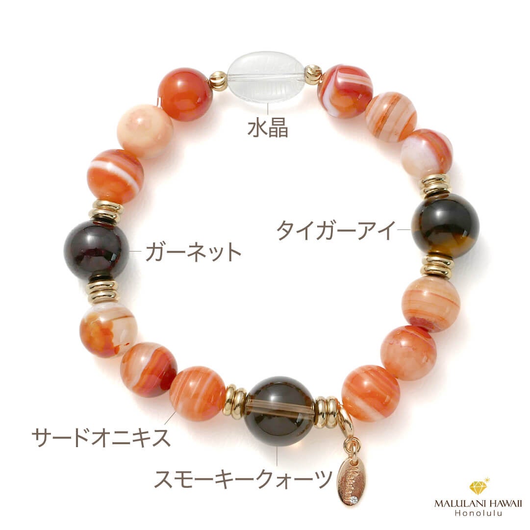 世界に一つの縞模様が楽しめるサードオニキスをベースに、スモーキークォーツやガーネット、タイガーアイで組み上げた、第1・2チャクラを活性化する、グラウンディングのブレスレット。