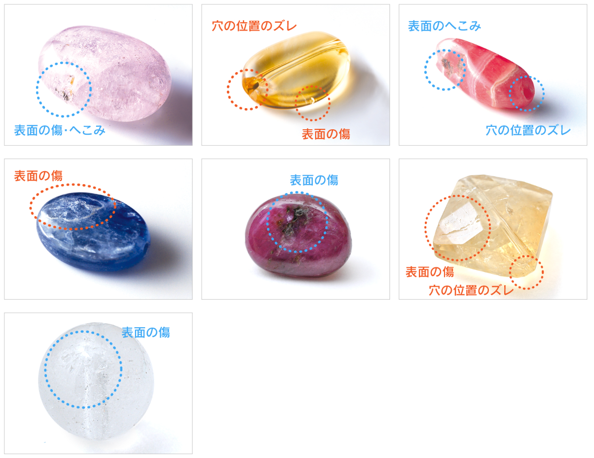 石の表面の傷、へこみ、穴の位置のずれ、色のバラつき、在庫多数など