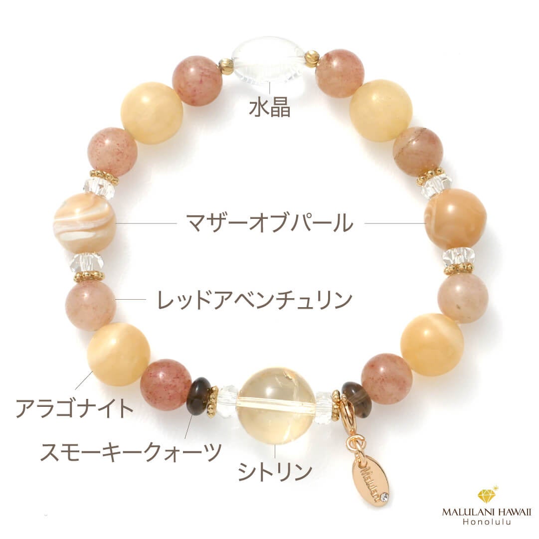 柔らかな温もりと上品な安らぎを感じさせる、アラゴナイトやマザーオブパール、レッドアベンチュリンに、シトリンが太陽の輝きを添えた、幸福と健康のブレスレット。