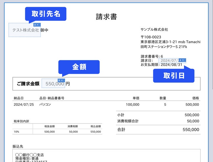 PDFから取引先名・取引日・金額を自動で読み取り、ファイル名に登録できる機能です。