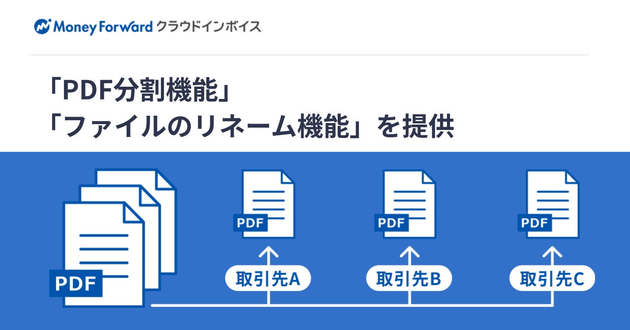 株式会社マネーフォワードは、『マネーフォワード クラウドインボイス』の送付機能(送付プラン)において、基幹システムから出力されるPDFを取引先ごとに分割できる「PDF分割機能」および、読み取った取引先コード・取引日・金額の情報をそのままファイル名に登録できる「ファイルのリネーム機能」の提供を開始しました。