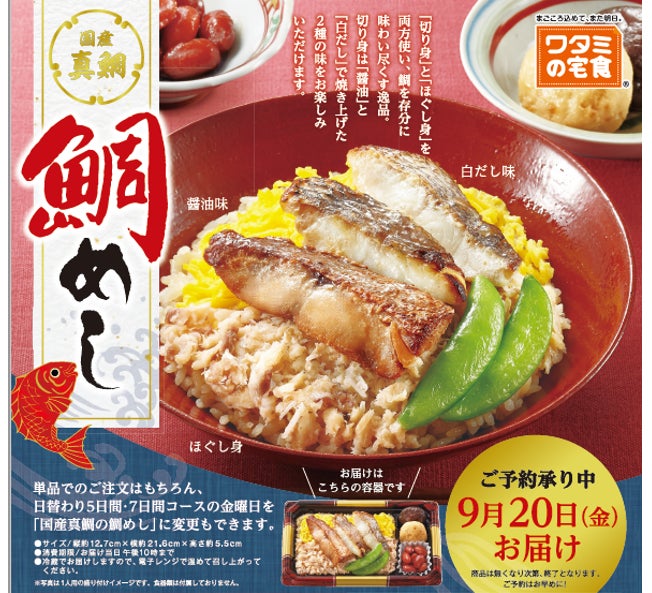 ワタミ株式会社(本社:東京都大田区、以下ワタミ)が運営する食事宅配サービス「ワタミの宅食」は、季節限定の特別弁当として「国産真鯛の鯛めし」を絶賛販売中です。