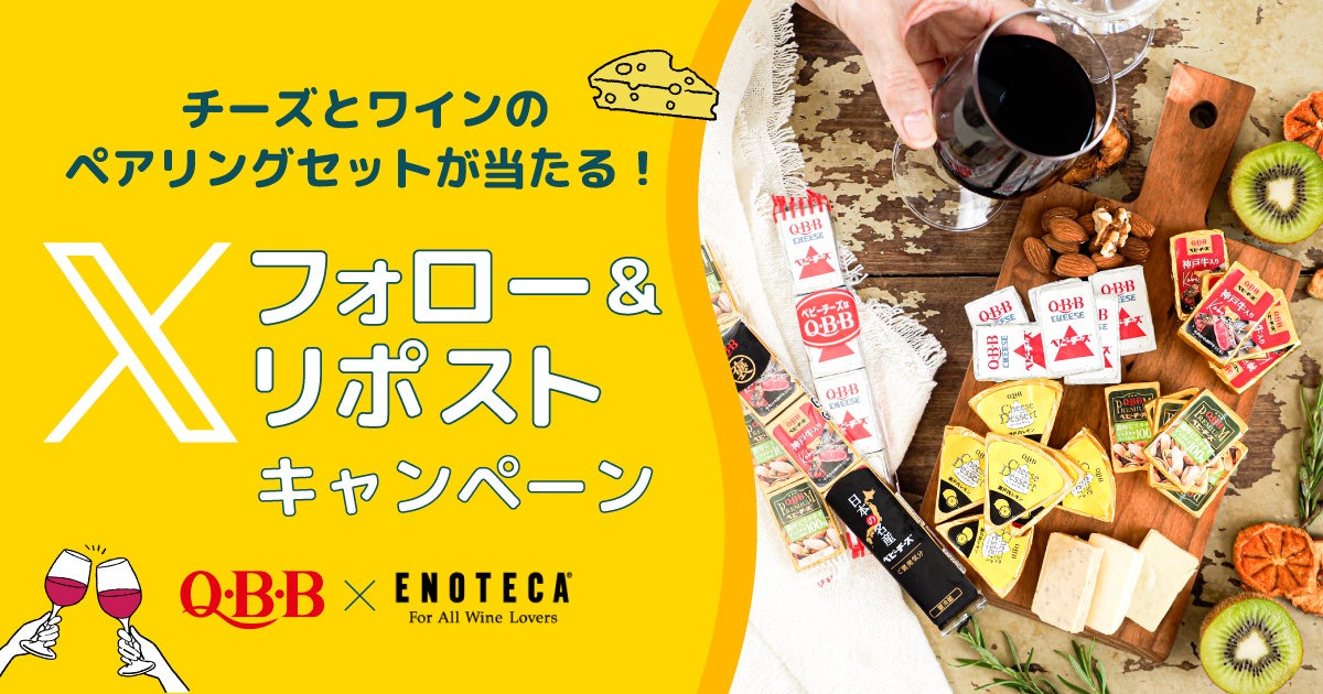 エノテカ株式会社(本社:東京都港区、社長:堀 慎二)は、ベビーチーズでシェアNo.1※のQBBベビーチーズを販売する六甲バター株式会社(本社:兵庫県神戸市 代表取締役社長兼CEO:塚本 浩康)と共同で「チーズとワインのペアリングセットが当たる! Xフォロー&リポストキャンペーン」を10月16日から両社の公式Xで実施します。「家飲みをもっと気軽で、おいしく、楽しい時間に」というコンセプトのもと、両社が選んだQBBチーズとエノテカワインのベストペアリングを紹介し、ペアリングが体験できる賞品をプレゼントします。エノテカ・オンラインの特設サイトでも、本キャンペーンの実施に併せてペアリングを提案し、自宅で気軽に楽しめるきっかけづくりに取り組みます。