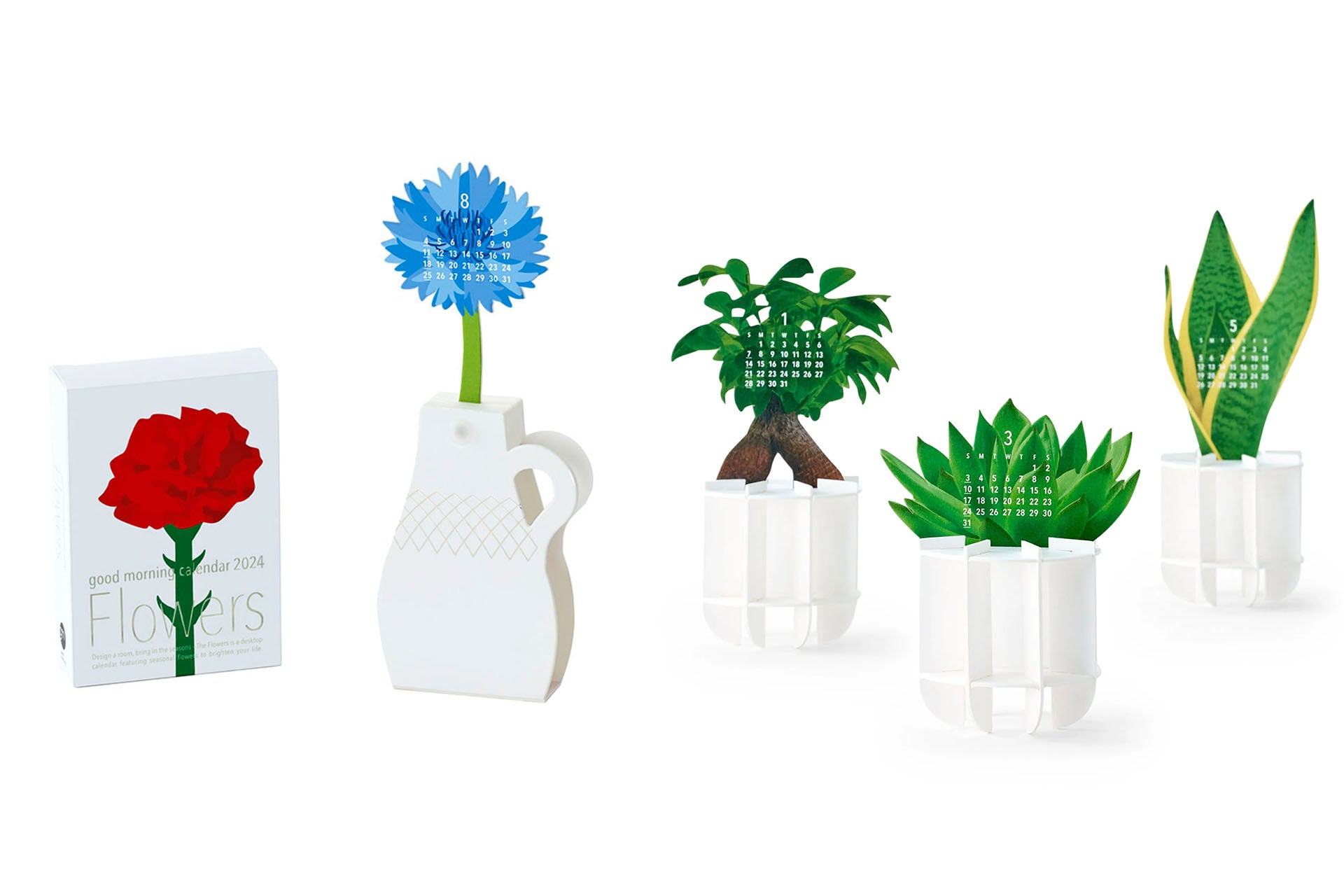 観葉植物をデザインモチーフにしたカレンダー。ポット型の台座を組み立てて、植物を差し込んで使います。グリーンのある暮らしを手軽に楽しめます。