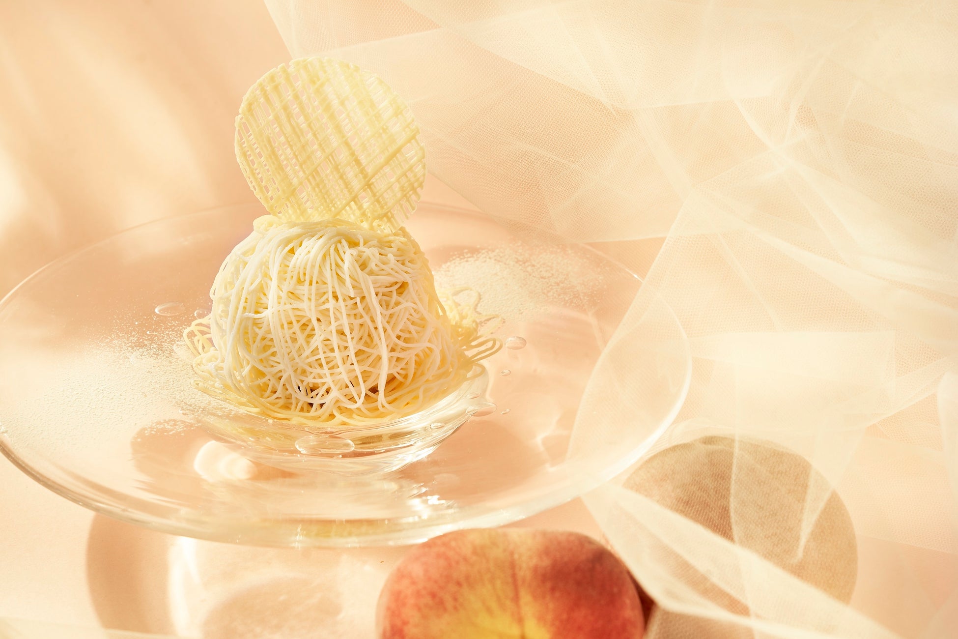まるごとひとつあら川の桃を使った贅沢なモンブラン。桃の中にはシンプルにバニラアイスを詰めて、ホワイトチョコレートのモンブランクリームで桃を包みます。桃の瑞々しさとバニラの優しい甘みをお楽しみください。