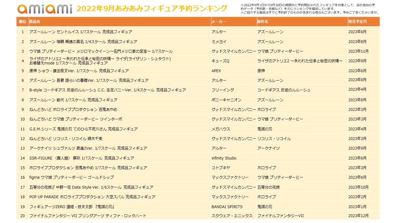 - ホビーショップ『あみあみ』の「2022年9月フィギュア予約ランキング」を発表!