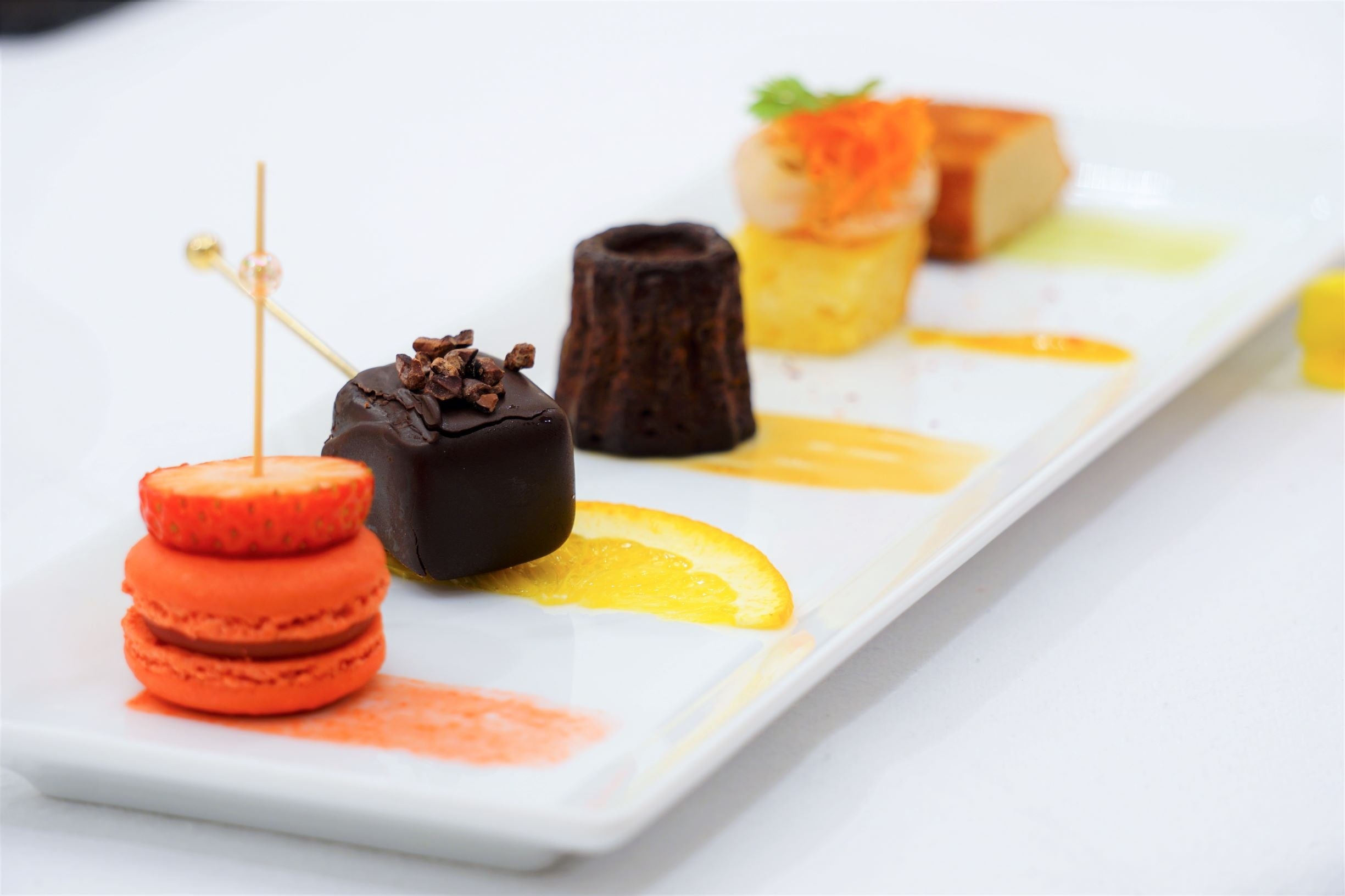 フィナンシェやカヌレ、マカロンなどのフレンチのクラシカルなスイーツから海老やフォアグラとの組み合わせから生まれる新たな味わいまで、驚きと喜びを詰め込んだメニューを提供します。出来立てだからこそ表現できる香りや食感、口どけなど、テイクアウトできるデザートとはひと味違うこの場でしか味わえない”瞬間のおいしさ”をお愉しみください。
