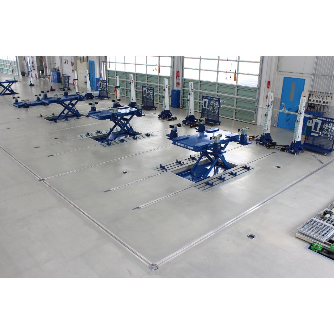 自動車板金(鈑金)作業のスタンダード、「スーパーフロアシステム」はアルミ合金製レールを埋設し、限られたスペースを最大限に活用し、板金(鈑金)作業を効率的に行うことが出来ます。