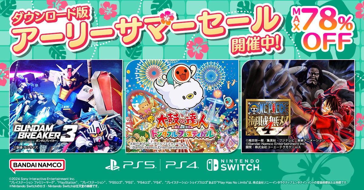 PlayStation®Storeでは「ガンダムブレイカー3 Welcome Price!!」が63%OFF、「ONE PIECE 海賊無双4」が20%OFFになるなどお買い得に!さらに、ニンテンドーeショップでは「太鼓の達人 ドンダフルフェスティバル」が24%OFFになるこの機会をお見逃しなく!