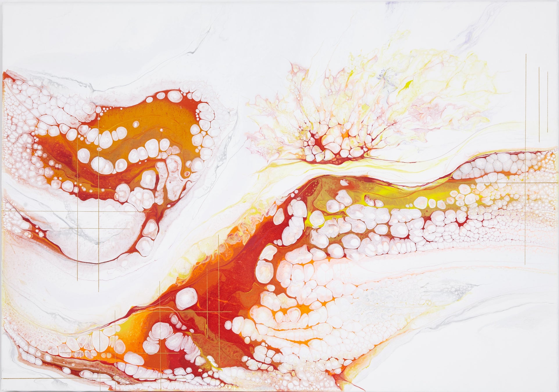 日々の中で奇跡のまばたく瞬間と、限りない不思議な美しさの偶然性を生みだすポーリングアートの世界を、キャンバスの上で表現いたしました。 轟 悠(藏人)