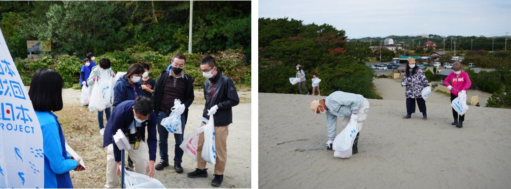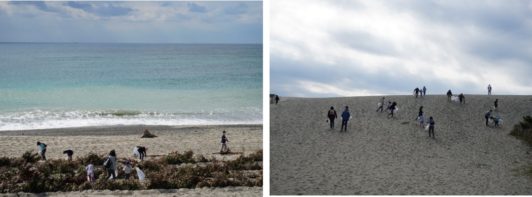 - 遠州灘を望む浜岡砂丘で3人1チームでごみ拾い