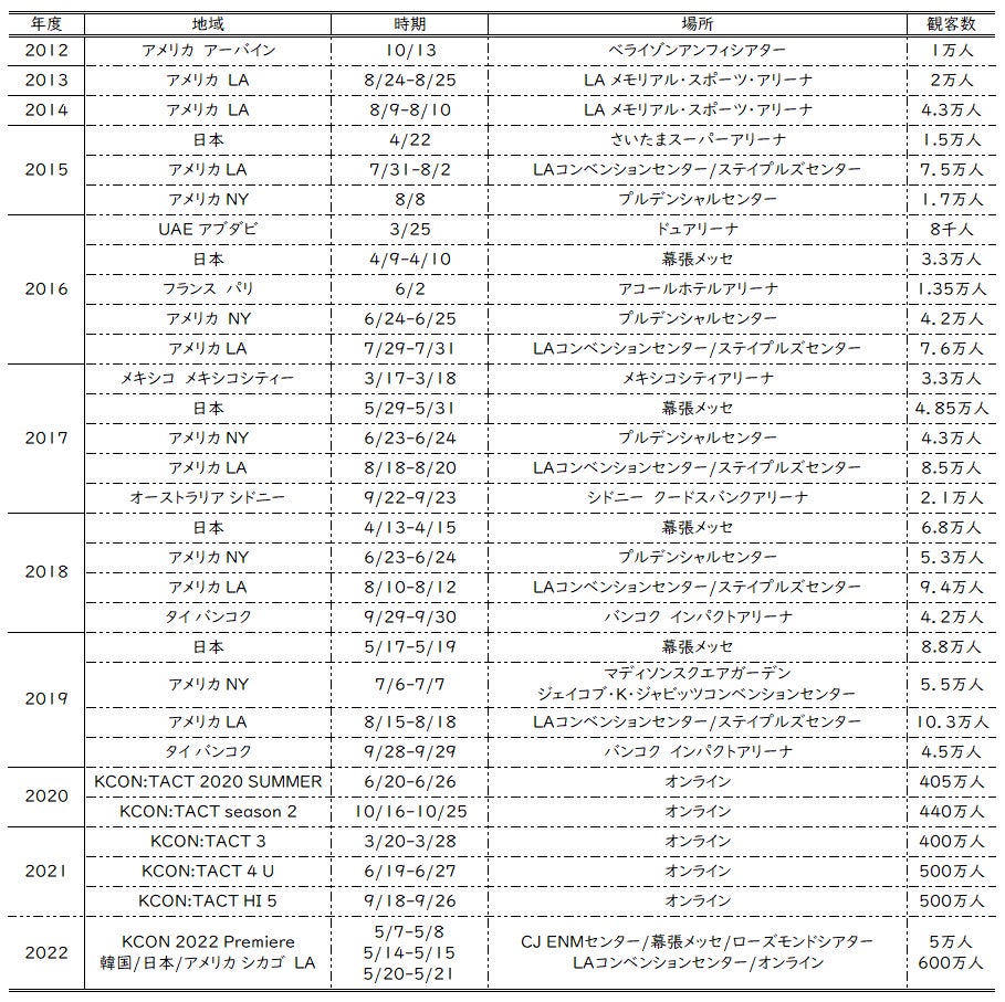 『KCON JAPAN』は2015年の日本での初開催から毎年その規模を拡大し、2019年まで5年連続にわたりオフラインで多くのファンの皆様と交流を図ってきました。2020、2021年のオンラインイベント『KCON:TACT』を経て、3年ぶりに本格的に日本に帰ってくる『KCON 2022 JAPAN』にどうぞご期待ください!