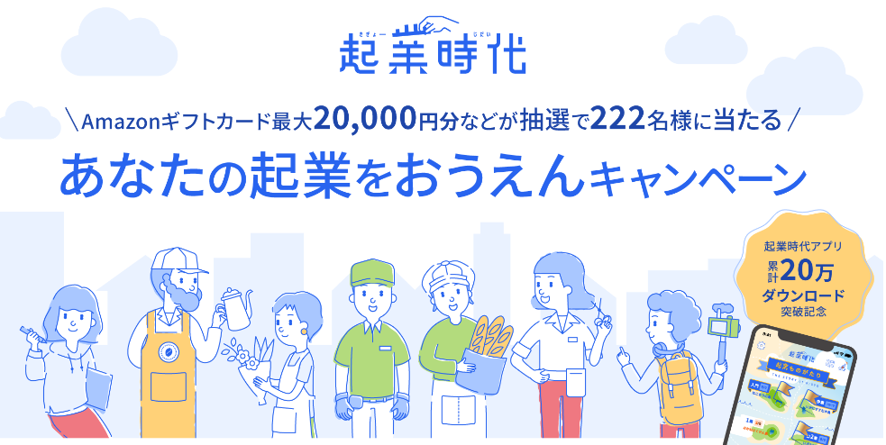 起業/開業の情報が詰まった起業時代のスマホアプリの20万ダウンロード突破を記念して「あなたの起業をおうえんキャンペーン」を開催します。