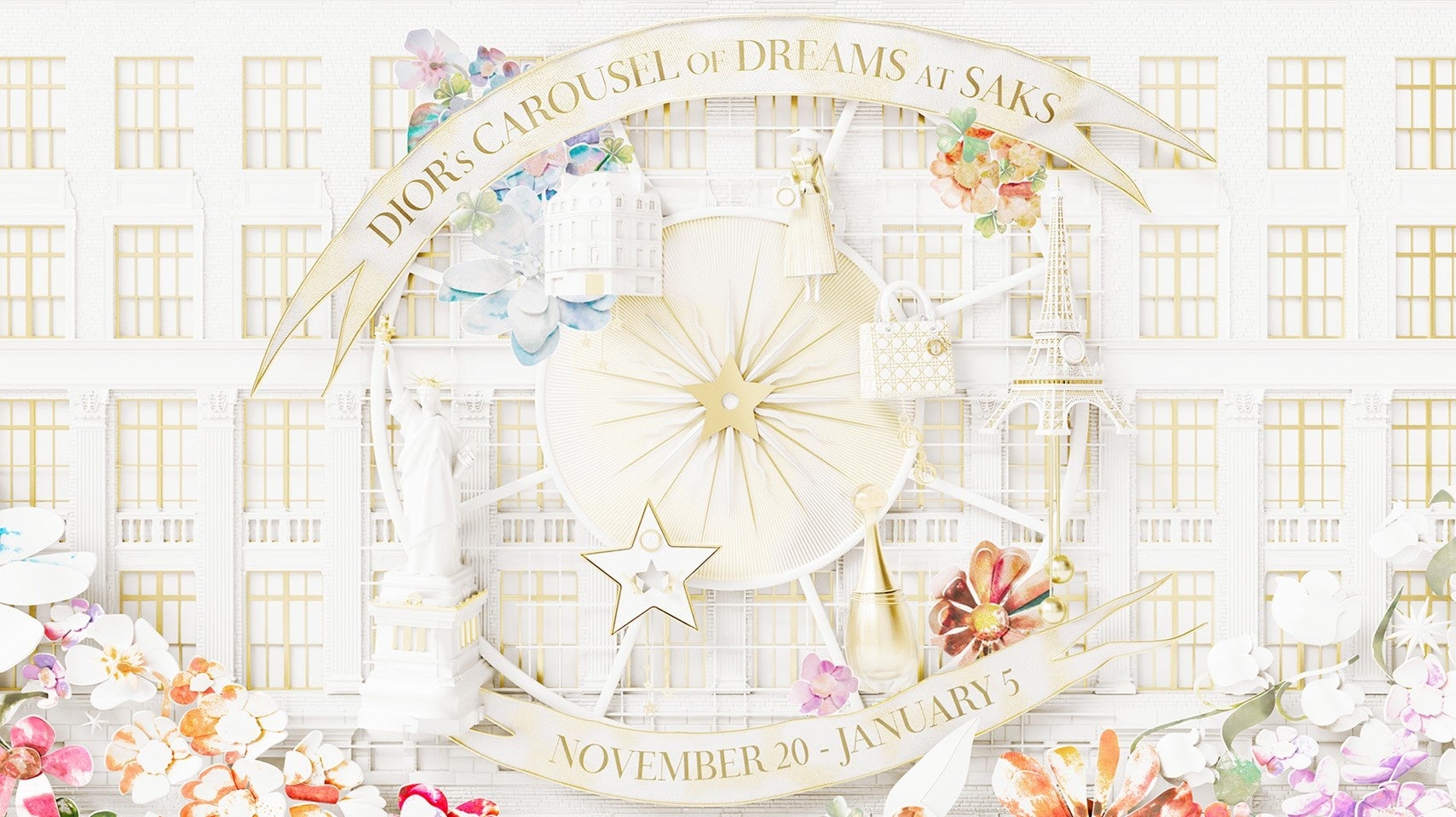 ホリデーシーズンの訪れを前に、ディオールは、70年以上にわたって築いてきたアメリカを象徴する百貨店サックス・フィフス・アベニュー、そしてニューヨークとの強固な絆にオマージュを捧げます。魔法のような夢のメリーゴーランドがアイコニックなファサードの上に登場し、24枚のショーウィンドウは驚きに満ちたミニシアターへと変容を遂げます。また、歴史あるサックス・フィフス・アベニューには壮麗なインスタレーションが登場し、幅35メートル以上の巨大な運命の輪*には、スターやクローバー、占星術といったディオールのコードがあしらわれ、創設者ムッシュ ディオールのレガシーとラッキーチャームを連想させます。咲き誇る花々がデザインされたこのインスタレーションは、毎夜まばゆい光の効果によって昇華され、毎年フィフス・アベニューのビルを華やかに彩る、イルミネーションの伝統を受け継ぎます。壮大なモニュメントからメゾンが大切にしてきたディテールへの美学まで、その魅力は、クリスチャン・ディオールのアメリカでの旅と1947年9月に初めてニューヨークを訪れたときの情景を物語る、魅惑的なミニチュアの象徴的なウィンドウひとつひとつに描き出されています。これはディオールのあらゆる世界観と時代を超越するシンボルを通じ、ディオールスタイルの卓越性と真髄を表現するまさに夢のような旅です。