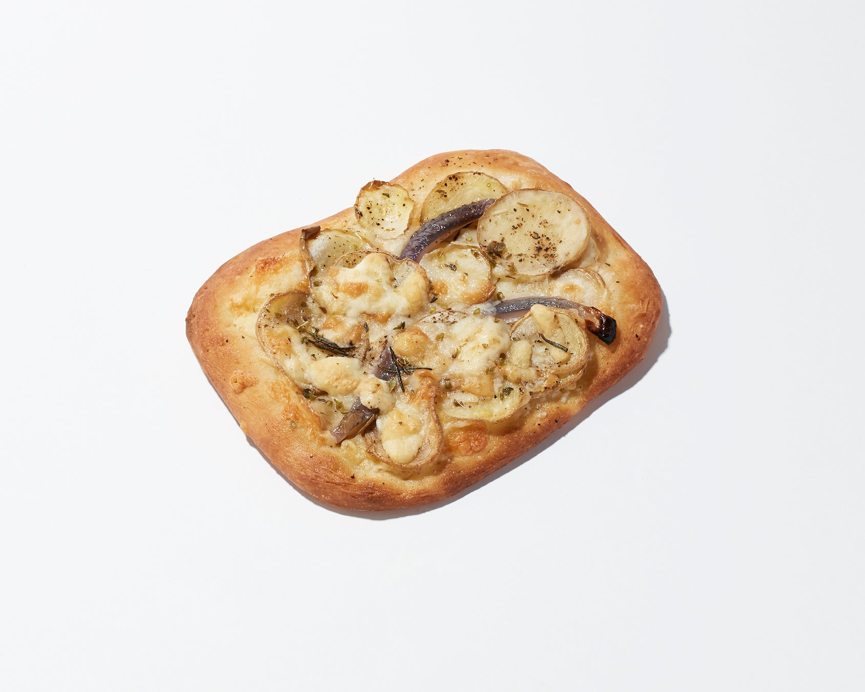 薄切りのじゃがいもとレッドオニオン、オリーブ、ミックスチーズを、フォカッチャ生地に乗せ焼き上げました。ブラックペッパーとオレガノがアクセント!