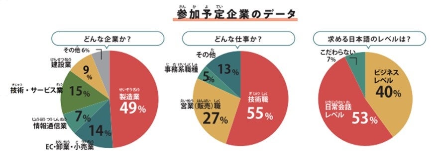 今回の参加企業147社の内訳を見ると、およそ8割が1都3県(神奈川・埼玉・千葉)以外の地方企業で占めています。また、業種別では製造業が49%を占め、求人職種についても技術職が55%と、専門人材を求める傾向は依然として顕著です。昨年と比較して、高度外国人材の採用予定数を5名以上とした企業が約2倍となり、高度外国人材を積極的に採用したい企業の参加が増加しました。また、企業による説明は日本語のみとした結果、昨年と比較してビジネスレベルの日本語を求める企業が増えました。