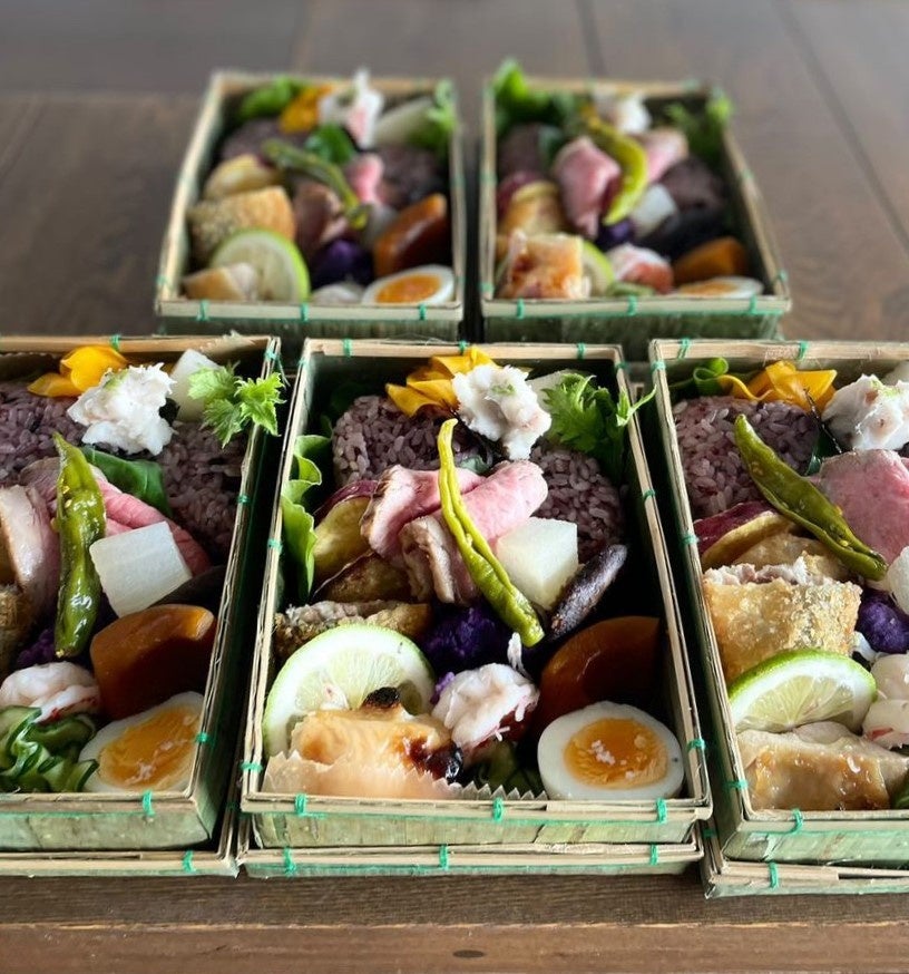 暮らしにフィットするだしの楽しみを提案する「おだしのうね乃」のおべんとうのお店。すべてのメニューにだしを使って和洋中のおいしさを提案しています。ごはんはすべて自社の無農薬米を炊き上げて。今回登場のおべんとうは、「ALLOUNENO」の人気No.1、おだし屋さんならではのおだしたっぷりなだし巻き玉子が丸ごと1本!香りのよい朝摘みの海苔の下には、おだしで炊いたごはんにおかかをサンド。お楽しみのおかずたちが隠れています。