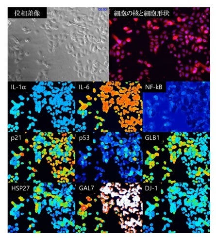位相差像(左上)と細胞の核と細胞形状の蛍光像(右上)、およびAIによる分化(Hsp27, GAL7)、炎症(Interleukin-1α (IL-1α), IL-6, NFkB)、老化(p21, p53, β-galactosidase (GLB1))、抗酸化(DJ-1)の指標となる各タンパク質の推定像。