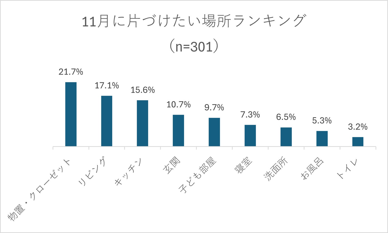 年末に向けた11月に最も片づけたい場所は「物置・クローゼット」、2位に「リビング」が続きます。季節柄使わないものや思い出の品など、捨てるかの判断に迷ってついものを溜め込んでしまうことに悩む人が多い様子。「キッチン」は3位にランクイン。