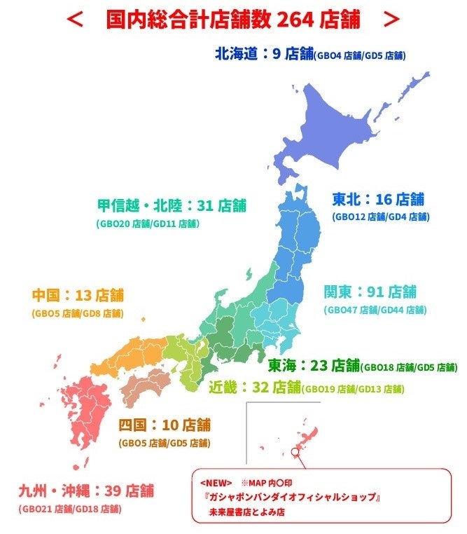 『ガシャポンバンダイオフィシャルショップ』未来屋書店とよみ店は、300面を一堂に展開するバンダイ公式の大型カプセルトイ専門店として、沖縄県豊見城市に出店します。バンダイの新商品をすべて取りそろえ、ここでしか味わえない「ガシャポン体験」を提供することで、「ガシャポン」の新たな魅力を発信していきます。また書店ならではのガシャポン体験をお届けするべく、随時お客さまへキャンペーン情報の発信等を行ってまいります。