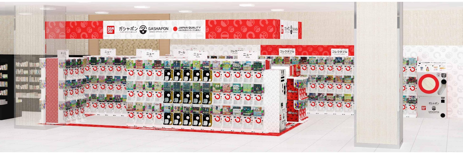 近年カプセルトイ業界では、大型のカプセルトイ専門店が増加し、身近なエンターテインメントとして多くのお客さまに楽しまれています。バンダイのオリジナルのカプセルトイブランドである「ガシャポン」ならではの「ワクワク体験」と「ユニークな商品」をファンの皆さまに向けて直接お届けしたいという思いから、バンダイと大型カプセルトイ専門店の運営ノウハウを持つバンダイナムコアミューズメントが協業で当店舗を出店します。