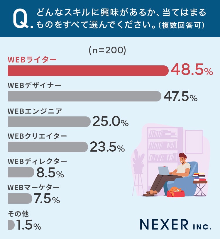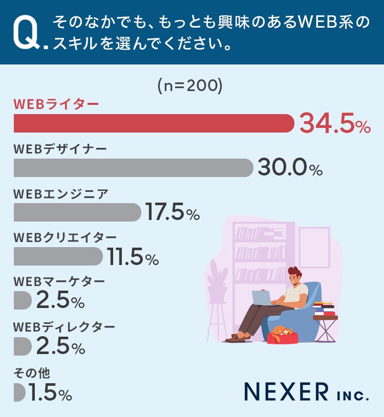「WEBライターやWEBデザイナーなどの『WEB系のスキル』に興味がある」と回答した方の34.5%が「WEBライター」にもっとも興味がある、と回答しています。