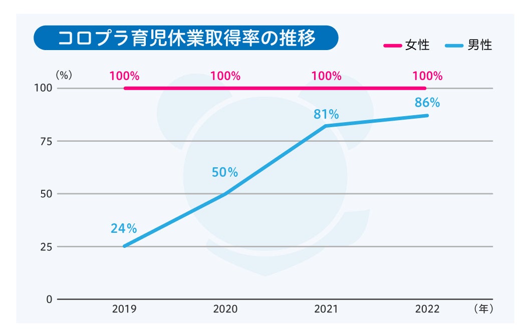 株式会社コロプラ(代表取締役社長:宮本貴志、本社:東京都港区、以下「コロプラ」)の2022年1月〜12月の育児休業取得率は、男性が86%、女性が100%でした。男性の育児休業取得率においては、厚生労働省が発表した調査値13.97%に対して、約6倍の取得率となります。また、育児休業からの復帰率は男女共に100%となりました。
