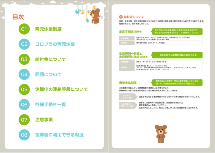 出産・育児に必要な公的手続きや社内手続き、復帰までの制度などをまとめたオリジナルの手帳です。産前産後休業及び育児休業取得者の声なども掲載し、産育休への不安軽減にも努めています。