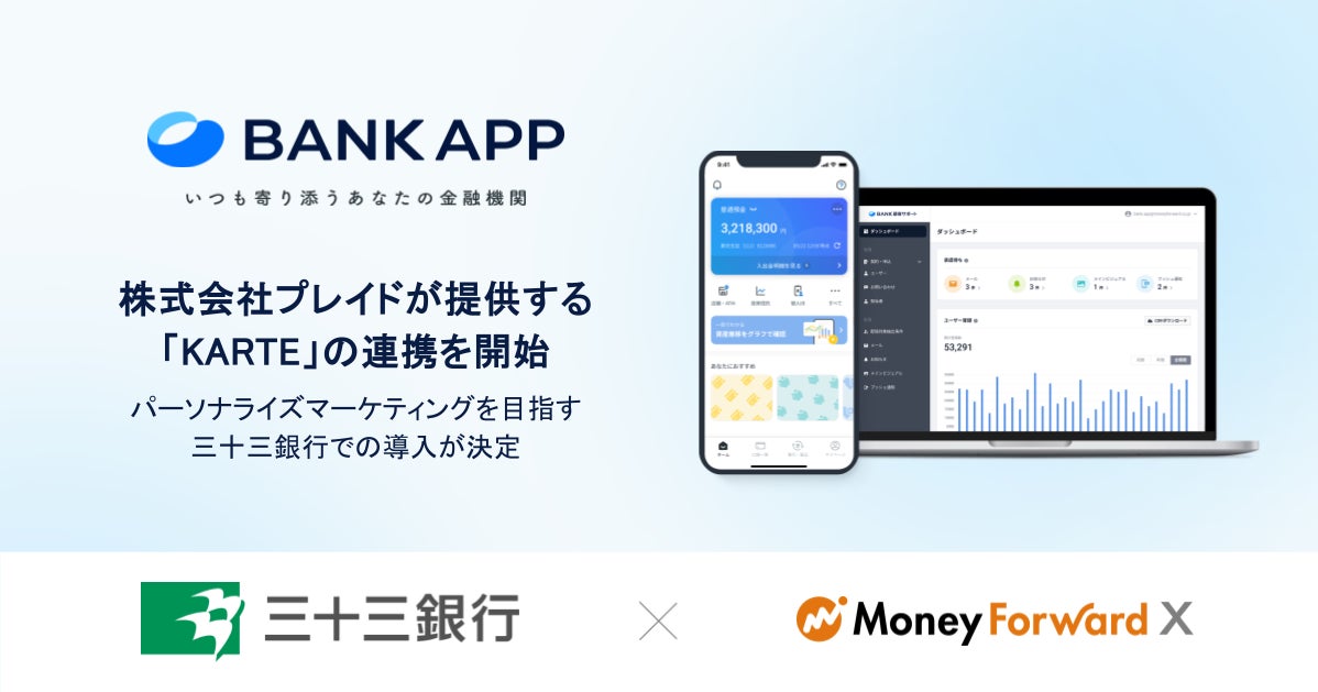株式会社マネーフォワードの金融機関向けサービスを開発する部門「Money Forward X」では、金融機関による個人顧客向けのマーケティング活動を支援する機能の開発を強化します。その取り組みのひとつとして、当社のバンキングアプリ『BANK APP』と、株式会社プレイドが提供するCX(顧客体験)プラットフォーム『KARTE』の連携により、データ分析に基づいたマーケティング活動を支援します。そしてこの度、『KARTE』と連携した『BANK APP』は、株式会社三十三銀行での導入が決定しました。