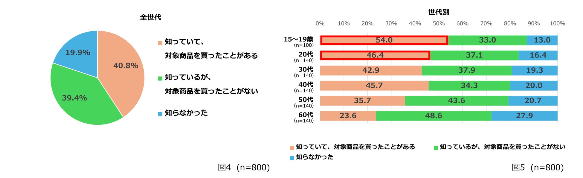 しかし、10代~20代の若年層は、「知っていて、対象商品を買ったことがある」の回答が他の年齢層よりも高くなり、「1個買うと1個もらえる」キャンペーンをうまく活用できていることが推察されます。(図5)