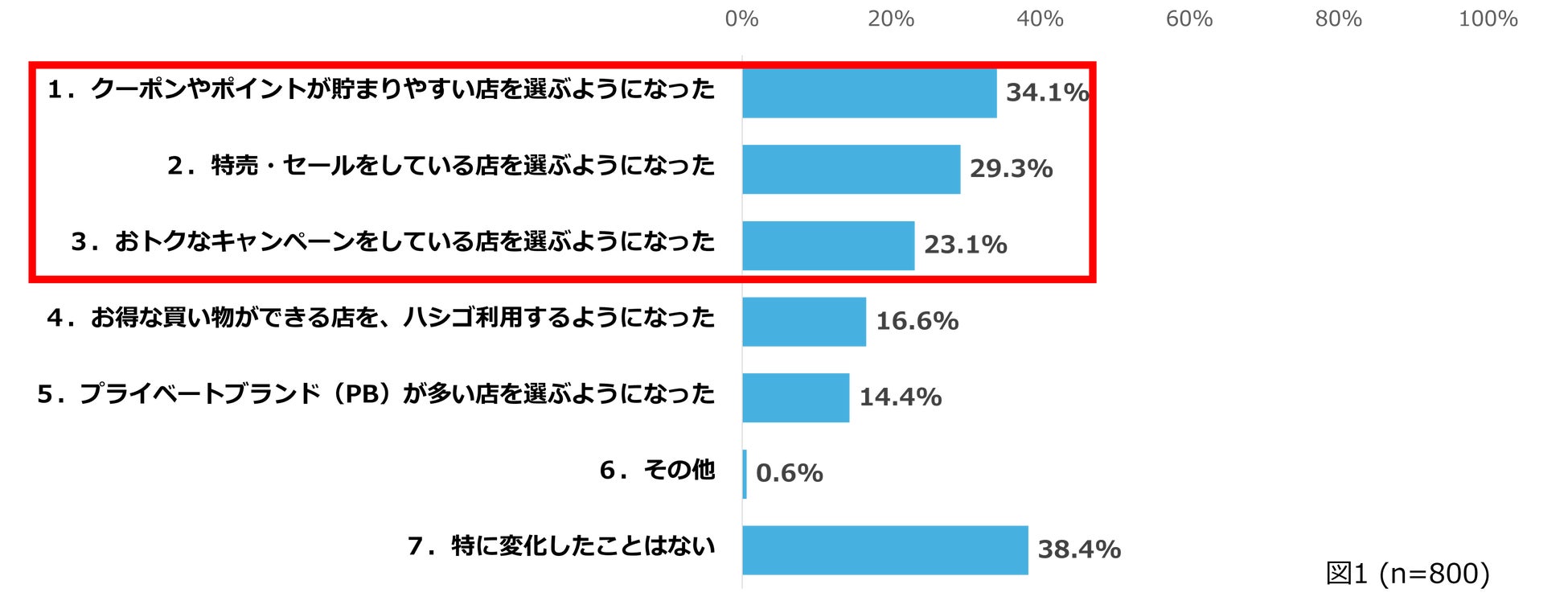 食品や生活用品の値上げが続く昨今、「お店選び」で変化したことについてお伺いしたところ、第1位「クーポンやポイントが貯まりやすい店を選ぶようになった」(34%)、第2位「特売・セールをしている店を選ぶようになった」(29%)、第3位 「おトクなキャンペーンをしている店を選ぶようになった」(23%)という結果となり(図1)、節約志向が高まる中、クーポンやセール、キャンペーンを意識して、お店選びしていることがわかりました。