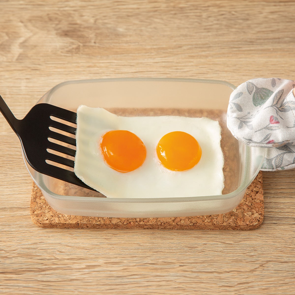 半透明なので、調理中の焼き加減や仕上がりを簡単に確認でき、そのまま食卓に出せるシンプルなガラスデザインです。