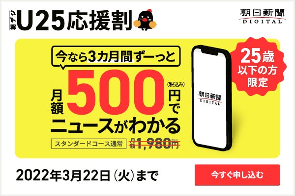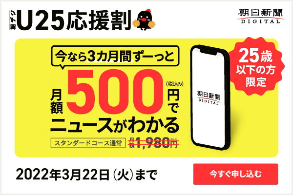 株式会社朝日新聞社(代表取締役社長:中村史郎)が運営するニュースサイト「朝日新聞デジタル」(https://www.asahi.com/)は、2022年2月21日(月)から2022年3月22日(火)まで『U25応援割』キャンペーンを実施します。